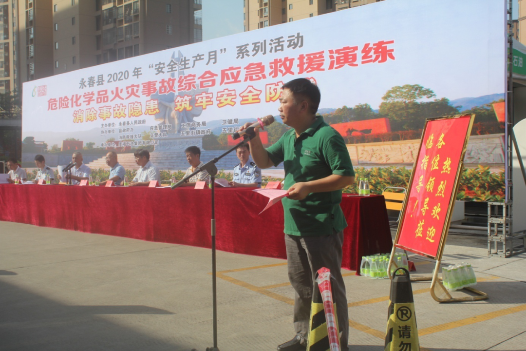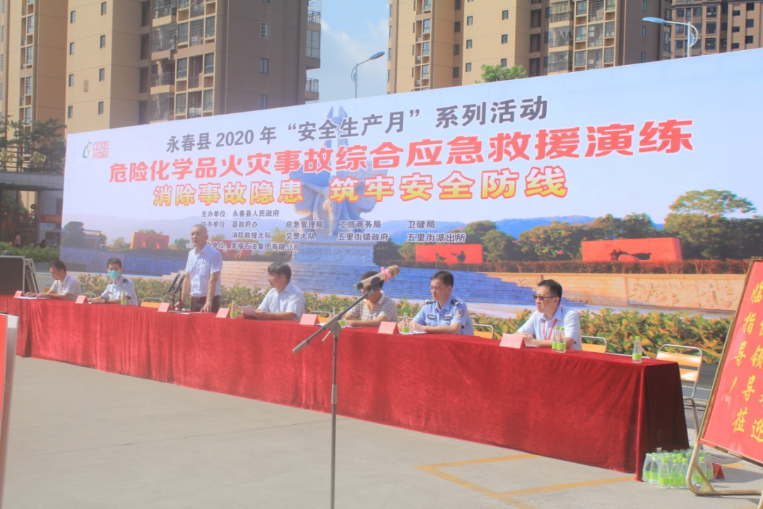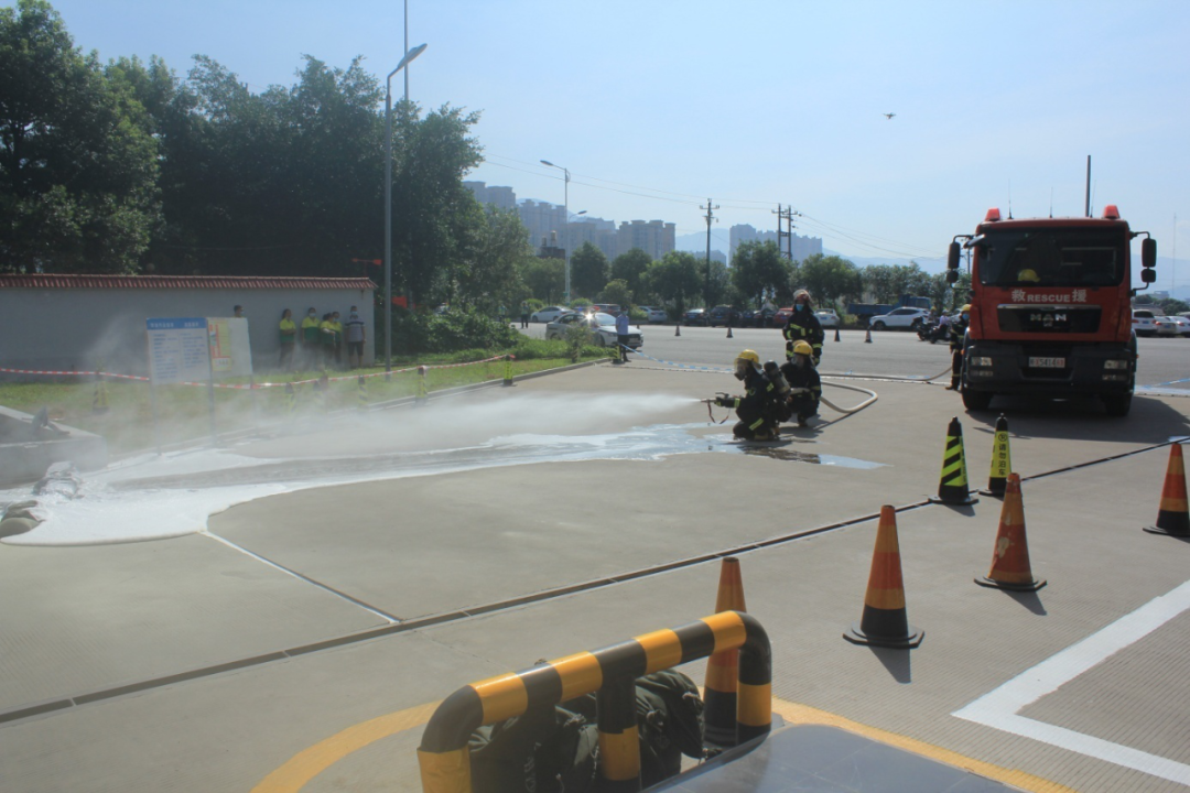第二科目模拟油罐车卸油泄漏引发着火事故应急救援综合演练。卸油时油管脱落造成油品泄漏,静电引发火灾,加油站立即自救并报警,各应急单位迅速联动,消防救援大队、120迅速赶到现场抢救。