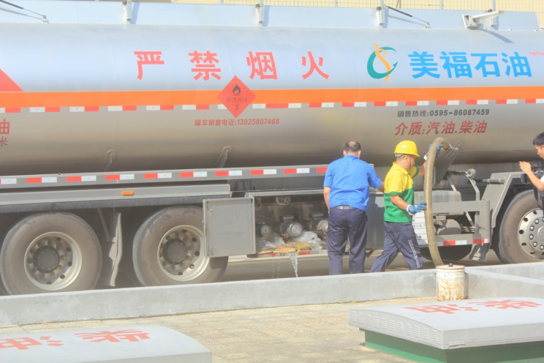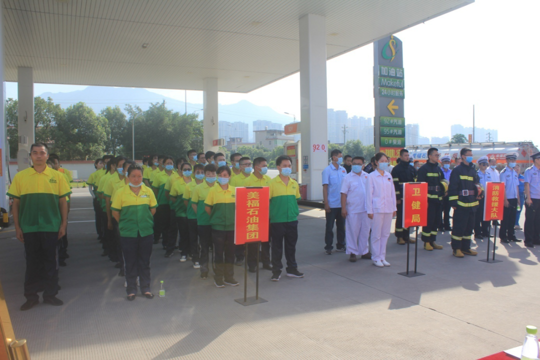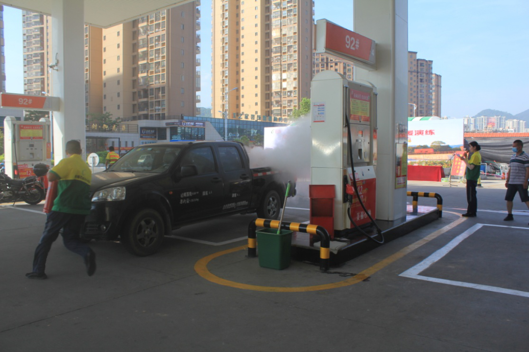 第一科目模拟加油车辆加油时着火事故应急救援演练。进站车辆在加油过程中突然着火,现场加油员立即停止加油作业、切断总电源、拉响警报、疏散现场车辆及人员,其他加油员用灭火毯盖住着火部位,用灭火器喷射,合力将着火车辆推到站外安全处。