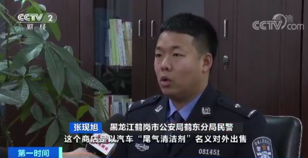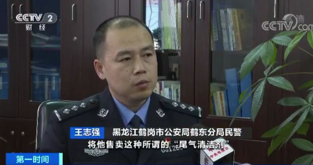 民警:我们通过秘密侦查、提取,将他售卖这种所谓的“尾气清洁剂”,送到了质量技术监督局检测中心进行了检验,检验显示它的各项数值和92号汽油的数值是完全相符的。